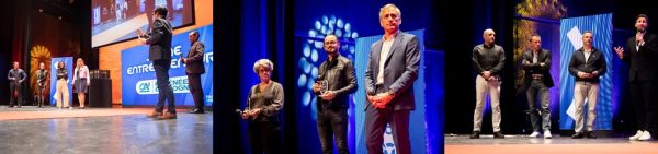 Avant de remettre les prix 2021, le Président de la CCI, Didier Laporte, a tenu à mettre en lumière 2 lauréats des « Mercures d’Or », en quelque sorte les finales nationales des Trophées régionaux 2020. Crise sanitaire oblige, il avait été jusqu’à présent impossible de féliciter en présentiel les lauréats béarnais. Injustice réparée pour Sarah Goupy (de la Manufacture du Béret d’Orthez) et Thierry Bordenave ( « les Hommes ont la Classe »), deux membres de notre réseau bien connus dans la région et au-delà. C’est en effet devant 250 de leurs pairs qu’ils ont enfin pu recevoir en main propre leur trophée… sous les applaudissements !